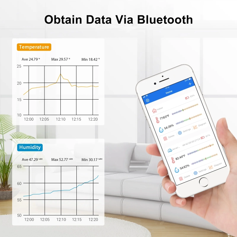 Monitor Bluetooth y aplicación: Podemos conectar ITH-12S con nuestro teléfono a través de Bluetooth y verificar la temperatura y la humedad a una gran distancia de hasta 98 pies/30 m. Un teléfono puede conectar varios sensores simultáneamente y viceversa.
